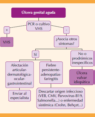 Es de igual importancia establecer el diagnóstico diferencial, con base en una anamnesis completa (antecedente de enfermedades sistémicas con especial atención en síntomas oculares, neurológicos, gastrointestinales y genitourinarios, y de actividad sexual y posibles abusos) y examen físico minucioso (piel, mucosa genital, oral y ocular) que ayuden a excluir lesiones ulcerosas secundarias a otras enfermedades, además de exploración de ganglios linfáticos y valoración de hepatoesplenomegalia.12