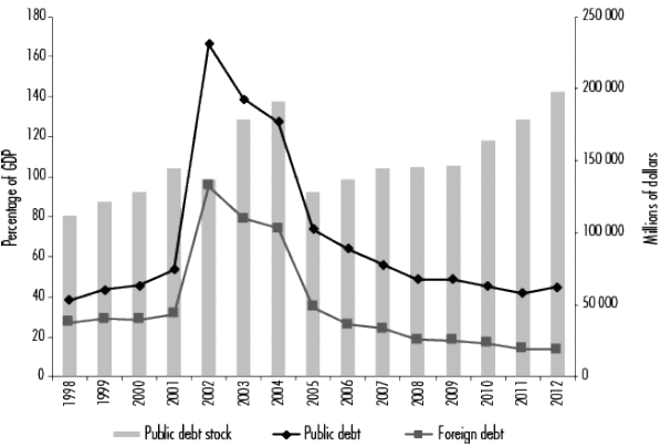 The debt stock as a percentage of GDP hit a high in 2002, at 166.4%, due to the effect of devaluation on the debt stock, because nearly 80% of the debt was in dollars. The bank bailout and other measures implemented to confront the crisis also drove up the public debt. Even so, the effect of the significant GDP drop on the denominator of this indicator as a result of the economic recession that same year should not be disregarded.