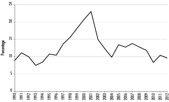 Figure 3 Interest Paid as a Percentage of Public Spending, 1990-2012