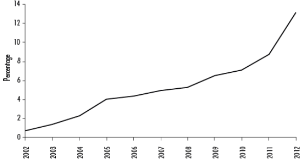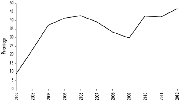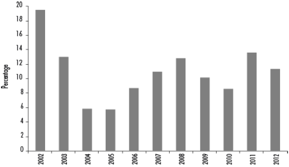 Figure 5 Percentage of BCRA Temporary Advances in State Public Debt, 2002-2012