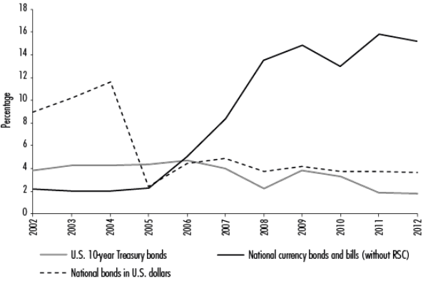 In the case of ANSES, in November 2011, 57.6% of the Sustainability Guarantee Fund's portfolio was in national public bonds, rising to 61.7% in the fourth quarter of 2012.12 The move from AFJPs in 2008 did not entail any change in the placement of the funds that comprised the contributions. Their destination continued to be primarily state funding.