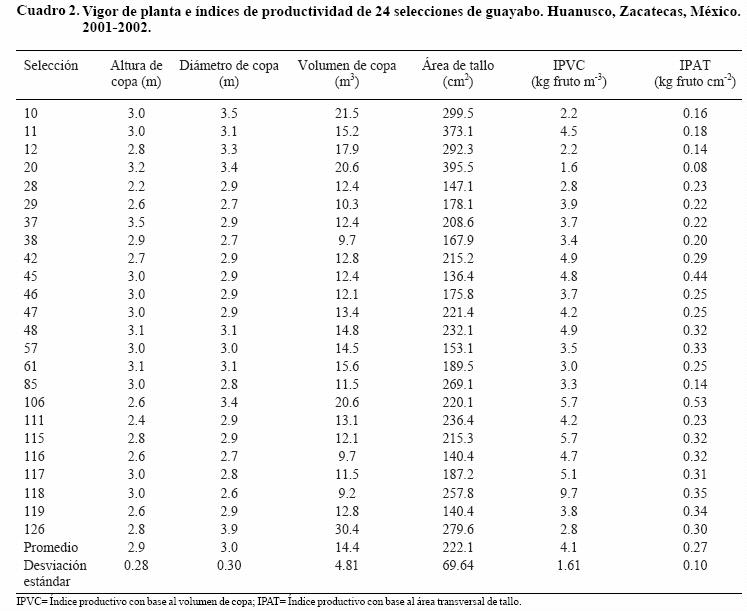 Guava (Psidium guajava L.) is one of the main fruit trees cultivated in Mexico, with a production area of 24 000 ha and annual production of 3 00 000 t. Fresh fruit production of 24 guava selections grown in Huanusco, Zacatecas, Mexico was recorded during 19992002, and then related to two productivity indexes: productivity index based on canopy volume and productivity index based on stem cross sectional area. This work was conducted in order to identify useful traits that can be used for the evaluation of productivity in landraces and breed guava germplasm in Mexico. All evaluated materials were identified and selected in the CalvilloCañones region. Fruit production ranged from 34 to 73 kg tree1, while the average number of fruits per tree was from 551 to 1514. Selections with greatest number of fruits were 11, 106, 126, 12, and 47. The most vigorous accessions were 118, 106, 115, 117, and 42. Positive associations between fruit production and productivity indexes were found.