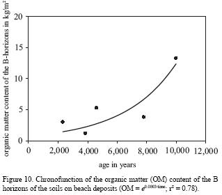 Several investigations on chronosequences have been carried out in North America on soils formed in sandy parent materials which are subjected to podzolization. Singleton and Lavkulich (1987) investigated a chronosequence of very young soils (127550 years) on beach sands of Vancouver Island. They described chronofunctions of organic matter, oxalate and dithioniteextractable Fe and Al and of available Ca, Mg and K. A mature Podzol with an E and Bs horizon developed after less than 371 years. Barrett and Schaetzl (1992) examined the podzolization process on sandy terraces of Lake Michigan. The development of a spodic horizon took about 4,000 to 10,000 years. In a further study Barrett (2001) described Podzol development in aeolian sediments at Lake Michigan. In this case, the formation of the spodic Bshorizon needed more than 5,000 years. In Scandinavia, chronosequences on sandy beach deposits and glacial outwash were established by Mokma et al. (2004). The age of the investigated soils ranged from 230 to 1,800 and 8,300 to 11,300 years. All soils showed E and Bs horizons, and the development of a Podzol took less than 8,300 years. The thickness of the total solum and of the characteristic Podzol horizons increased with time. The comparison of these studies shows that the temporal dynamics of podzolization processes may vary considerably. Most of the differences in the velocity of soil development can be explained by different climate and parent material.