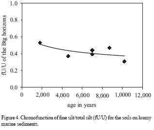 The pH values increase with soil depth, in the youngest soil from 3.7 to 5.4, and in the oldest soil from 3.9 to 6.9 (Figure 3). The type of organic surface layer in the younger soils (up to 7,000 years) ranges from mull to moder, and in the older soils between moder and raw humus. There is a slight decrease in the ratio of fine silt to total silt in the Btghorizons from 0.53 to 0.29 (Figure 4).