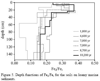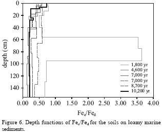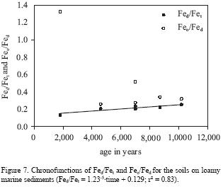 The maxima of Fed/Fet and Feo/Fed in the B horizons indicate translocation of iron from the A into the B horizons and formation of pedogenic iron oxides. The Fed/Fet ratios increase with soil age because of progressive weathering and formation of pedogenic iron oxides, whereas the increase in the Feo/Fed ratios with age is probably related to the formation of organic complexes, which inhibit the crystallization process.