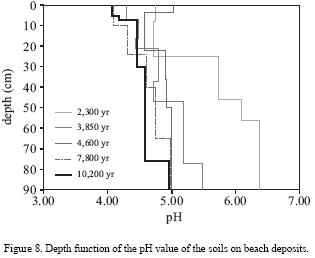The pHvalues increase downwards (Figure 8). For the pH chronofunction, the weighted mean values of 2090 cm depth were used, because the pH of the A horizon of the 4,600 years old soil shows some influence from the surface. The mean values decrease with soil age from 4.5 in the youngest soil to 3.8 in the oldest (Figure 9).