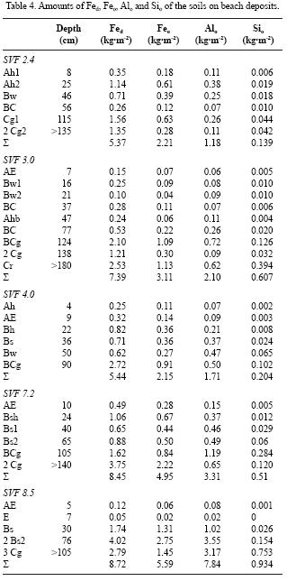 El desarrollo de los suelos de tipo Podzol se estudió en una cronosecuencia de suelos desarrollados a partir de depósitos de playa arenosos, cuyas edades varian entre 2,400 y 8,500 años. Todas las propiedades de los suelos el contenido de materia orgánica en los horizontes B, el contenido de arcilla, Feo, Alo, Sio, Feo/Fed y Fed/Fet tienden a incrementarse al avanzar la podzolización y están fuertemente correlacionadas con la edad del suelo. El pH del suelo superficial disminuye con el tiempo. Los horizontes característicos Bh y Bs se desarrollaron después de aproximadamente 4,000 años.