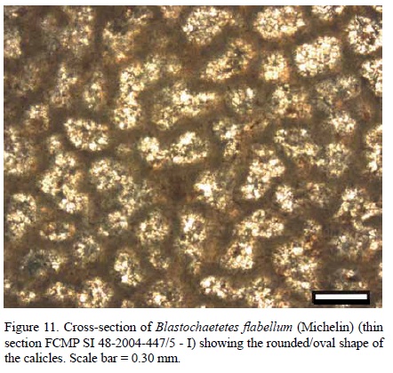 Species determination was difficult, since there are no visible hints of any microstructural wall characteristics and not all described characters are unique to any particular species of Blastochaetetes. Although most internal dimensions are similar to those of Blastochaetetes flabellum (Michelin), some variations exist and will be discussed next. Internal calicle diameter (0.15 to 0.30 mm) is slightly lower than the one indicated in the diagnosis of this species (0.20 to 0.35 mm from Fischer, 1970). In addition, more remarkable differences exist between the dimensions of tabulae thickness. Tabulae in the specimen analysed here range between 0.04 and 0.05 mm, being thus significantly thicker than those described by Felix (1914) and Fischer (1970).