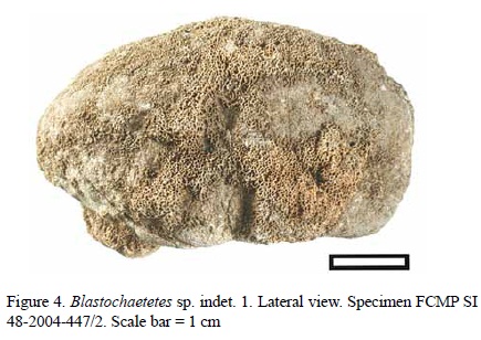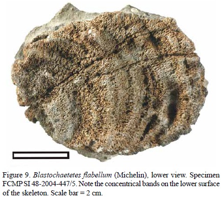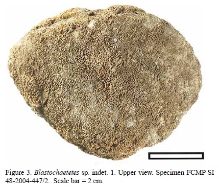 Nevertheless, since the remaining diagnostic morphological dimensions coincide with those from the redescription of Fischer (1970), this specimen can be conferred to the species Blastochaetetes flabellum. This is reinforced by the presence of concentric bands on the upper surface of the colony, unique to this species.