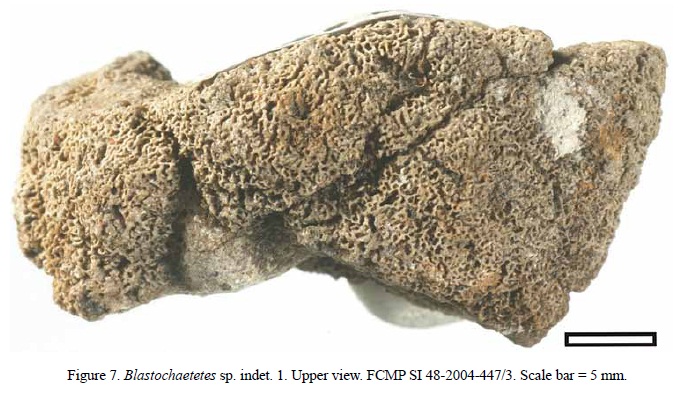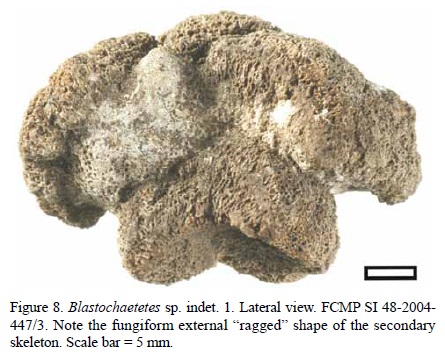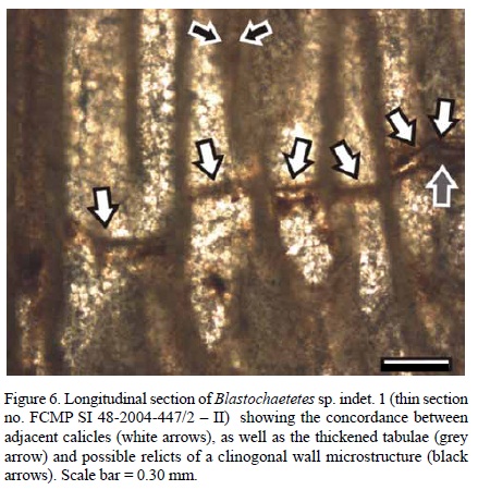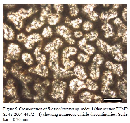 Discussion. Due to the scarcity of specimens and to the lack of sufficient diagnostic characters to erect a new species epithet, we decided to let the taxonomical classification for this species with an open nomenclature. However, some affinities exist for certain characters between these specimens and some other species of the genus Blastochaetetes, which will be discussed next, as well as the impossibility to name a new species based solely on these affinities.