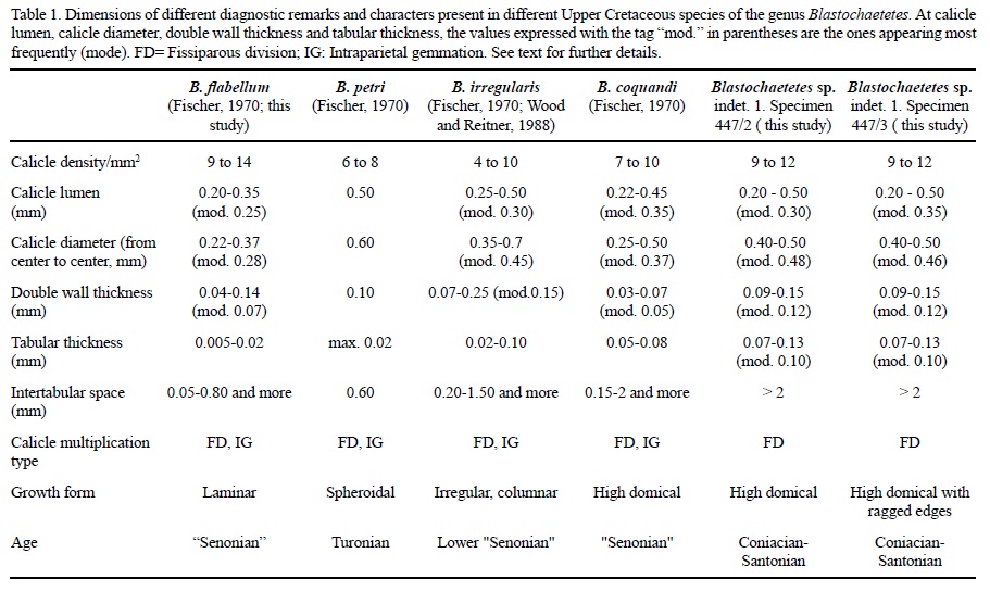 Blastochaetetes flabellum [(Michelin), Senonian of d'Alais, France], Blastochaetetes petri [(Zuffardi-Commerci), Turonian of Presso Teghirinna, Italy], Stromatoaxinella irregularis [(Michelin), Lower "Senonian" of Martigues, France] and Blastochaetetes coquandi [(Michelin), Senonian of Mazaugues; France] do not differ much between each other in calicle density/ mm2 and calicle diameter (Table 1). These characters also display almost no variation in specimens 447/2 or 447/3, and cannot be useful in the determination of a new species.