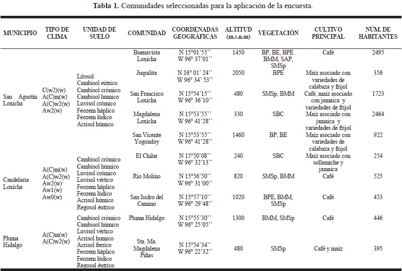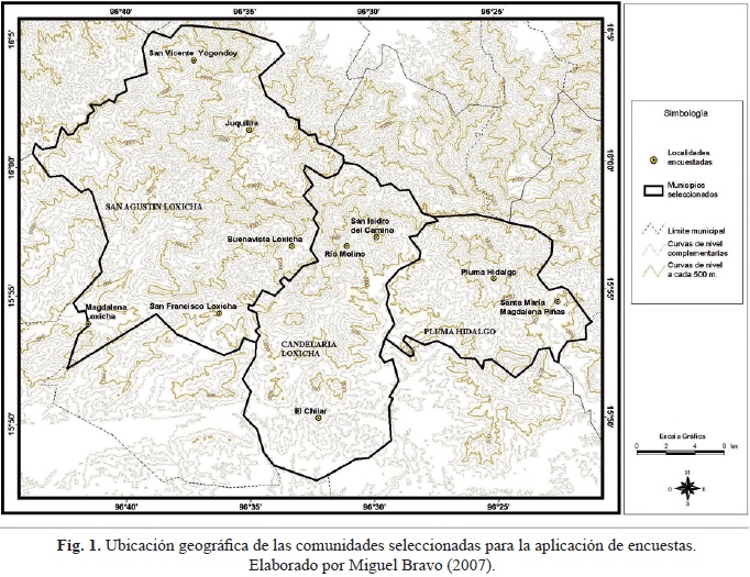 Con base en los censos poblacionales del INEGI (2000), la altitud, el tipo de vegetación y los recorridos generales realizados dentro de los tres municipios, se seleccionaron diez comunidades en las que se aplicaron las encuestas (tabla 1, Fig. 1). De éstas, siete comunidades se clasificaron como zapotecas debido a que más del 90% de los habitantes habla la lengua zapoteca (e. g., son monolingües o bilingües) y están conformadas por personas que descienden de generaciones establecidas a partir del siglo XVI. Las tres comunidades restantes se caracterizan porque menos del 1% hablan zapoteco y están conformadas por habitantes descendientes de inmigrantes zapotecos y mestizos de Miahuatlán pero que abandonaron la lengua zapoteca.