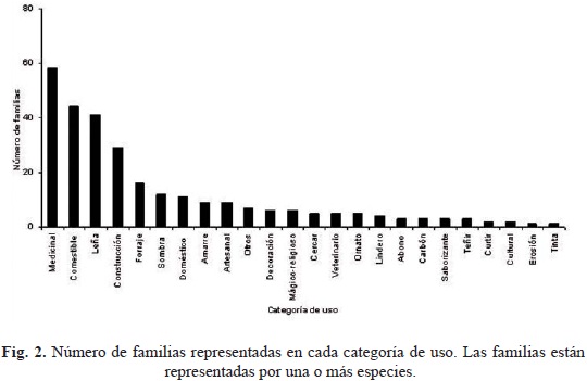 Las categorías de uso más importantes son el medicinal con 58 familias y el comestible con 44 (Fig. 2).