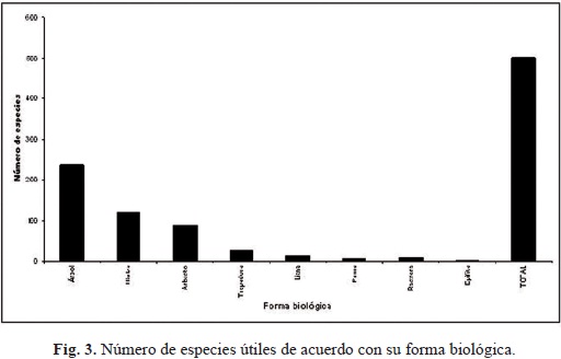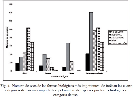 Formas biológicas. Se registraron ocho formas biológicas para las especies útiles, de las cuales la forma arbórea concentra la mayor proporción de especies útiles, con 237 especies. Le siguen en menor número las hierbas con 119 y los arbustos con 88 (Fig. 3). Todas las formas biológicas están representadas por diversos usos. Sin embargo el uso medicinal concentra a las especies herbáceas, mientras que para la construcción se utilizan los árboles (Fig. 4).