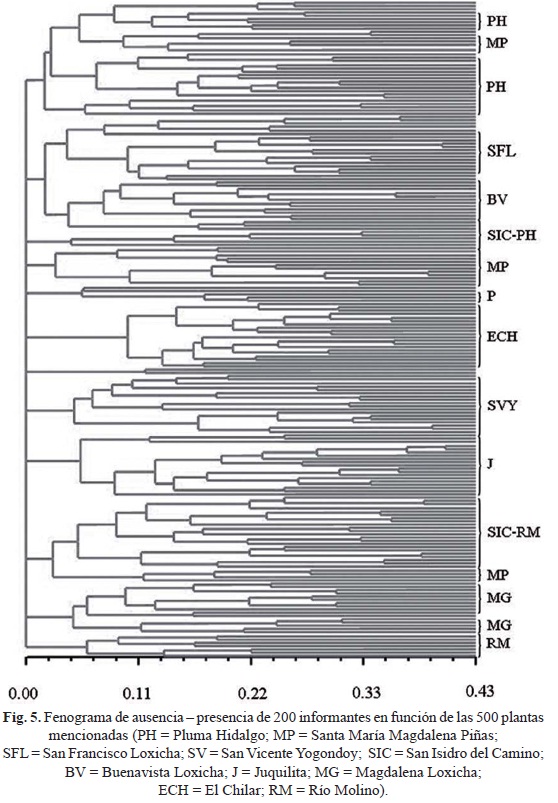 El análisis de similitud muestra una relativa similitud entre los individuos de cada comunidad. Se observan grupos más o menos definidos que corresponden a las diferentes comunidades. En el caso de las comunidades de San Isidro La Galera, Pluma Hidalgo y Magdalena Piñas, si bien tienen predominancia mestiza, no conforman un grupo aislado. Por el contrario, se intercalan con individuos de otras comunidades y su proximidad con determinadas comunidades está más relacionada con el tipo de vegetación (Fig. 5).