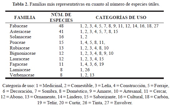 Familias de plantas útiles. Se registraron un total de 555 especies, pertenecientes a 301 géneros y 113 familias, de las cuales 20 incluyen al 50% de las especies útiles y están representadas por al menos dos especies útiles, mientras que el resto de las familias están integradas por una sola especie útil. Las familias sobresalientes son Fabaceae, Asteraceae y Solanaceae (tabla 2). Debido a que 22 especies están identificadas a familia, en la tabla aparecen 522. El resto de los análisis se realizaron con las 555 entidades ya que existe la certeza que son especies diferentes pero debido a que solo fueron colectadas hojas o tallos, no pudieron identificarse a familia.