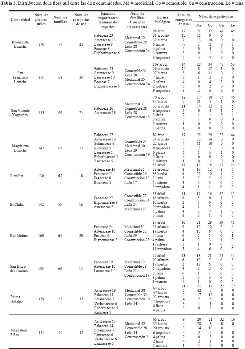 Distribución de la flora útil entre las diez comunidades. La distribución de la flora útil entre las comunidades es heterogénea (tabla 3). El número de familias varía de 55 a 77. El mayor número de familias se encuentra en la comunidad de Buenavista Loxicha. La familia Fabaceae sobresale en ocho comunidades, mientras que la familia Asteraceae es la más importante en las comunidades de Pluma Hidalgo y Magdalena Piñas. El número de categorías de uso va de 12 a 20. El mayor número de categorías se encontró en la comunidad de Buenavista Loxicha y San Vicente Yogondoy. En general, la categoría de uso más importante es la medicinal.