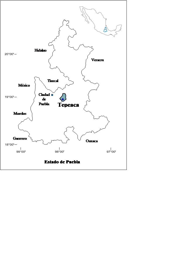 El municipio de Tepeaca se localiza en la parte central del estado de Puebla. Sus coordenadas geográficas son 18°55’30” y 19°06’18” de latitud norte y 97°48’18” y 97°59’18” de longitud oeste, con altitud promedio de 2238 msnm (Fig. 1).