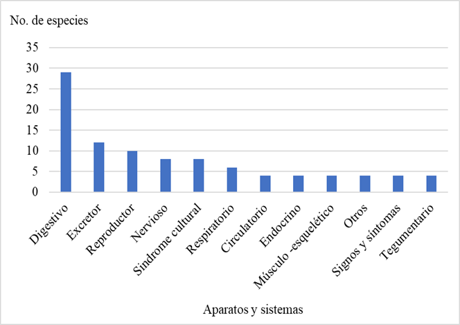 Con las plantas medicinales registradas se tratan 46 padecimientos que se pueden agrupar por aparatos y sistemas del cuerpo humano en 12 categorías (Cuadro 2, Fig. 3).