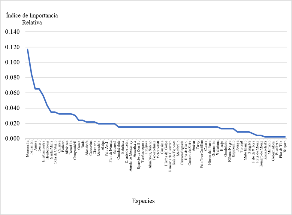 Las seis especies con mayor IIR, y que pueden considerarse las de mayor importancia cultural, son todas cultivadas, lo que reafirma su importancia (Escobar, 2016), pero algo que llama la atención es que cinco son introducidas y solo una es nativa. Lo anterior puede ser debido a que dichas especies exóticas fueron introducidas de manera muy temprana luego de la invasión española al territorio que ahora es México y están, luego de más cinco siglos, plenamente incorporadas como recursos herbolarios de la medicina tradicional mexicana, son especies que se encuentran frecuentemente en huertos y traspatios, además de que su cultivo comercial es también frecuente.