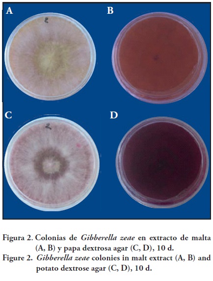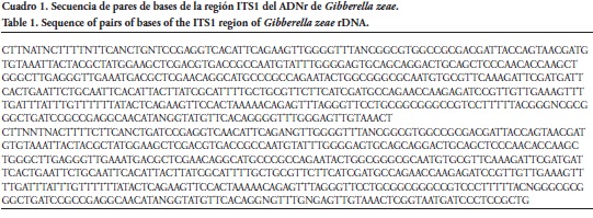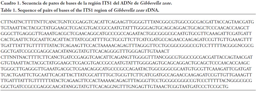 La caracterización molecular del hongo por secuenciación (Cuadro 1) de la región intergénica ITS1 del ADN ribosomal y su posterior alineamiento con las bases de datos del Banco de Genes del NCBI, reveló una similitud genética con G. zeae (teleomorfo), cuyo anamorfo es F. graminearum. Las características morfológicas de las colonias y esporas fueron similares con las descripciones de F. graminearum reportadas por Booth (1971) y Nelson et al. (1983). Las colonias en PDA fueron blancas de micelio raso (plano, corto) y denso al principio y de micelio largo (aéreo) algodonoso a mayor edad de la colonia, con márgenes blancos a rojo púrpura. Las macroconidias (27.4 x 2.4 µm) fueron menores a las reportadas por Booth (1971).