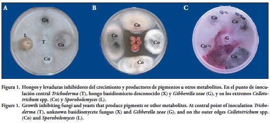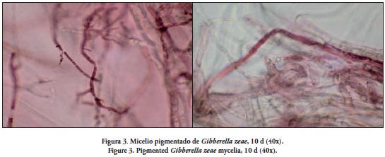 Así, se seleccionó un hongo saprofito (Gibberella sp.) recolectado de material vegetal muerto en descomposición, el cual no produjo esporas en condiciones ambientales (23 ±2 °C), pero sí un pigmento rojo-púrpura o amarillo-rosáceo de mayor intensidad en medio sólido que P. herbarum (Figura 2). Para favorecer la producción de esporas, las colonias se pusieron bajo luz negra y UV, como lo indican Snyder y Hansen (1947), Zachariah et al. (1956) y von Arx (1981). La identificación reveló que era Fusarium sp. La producción del pigmento comenzó a los 5 d y se encontró principalmente en el micelio inmerso en el medio de cultivo (Figura 3). La producción de pigmentos rojo púrpura o carmín es típica en las especies de Fusarium de la sección Discolor, como F. reticulatum Mont. [W&R, G], F. sambucinum Fuckel [W&R, G, B, J], F. culmorum (W G. Smith) Sacc. [W&R, G, G, B, J], F. crookwellense Burgess, Nelson & Toussoun, además de F. graminearum (Nelson et al., 1983). En otras especies la coloración puede ser diferente como el F. roseum (Lk.) Emend, Snyder & Hansen, con colonias amarillas a rosadas (Watanabe, 2002).