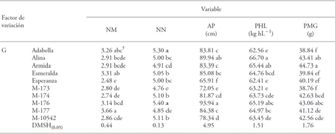 †Means in a column and variation factor with different letters, are statistically different (Tukey; p≤0.05). DMSH: least honest significant difference; G: genotype; NM: number of tillers; NN: number of nodes; AP: plant height; PHL: hectoliter weight; PMG: thousand-grain weight. G represents the average of each G in FS and C.