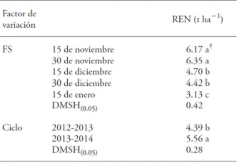 The results of this study coincide with those of Solís et al. (2004), who evaluated wheat cultivars in El Bajío. They found no differences in grain yield when sowing was between November 15 and December 15. However, when sowing was on January 15, grain yield was lower because the number of grains per spike decreased and the grains were smaller.