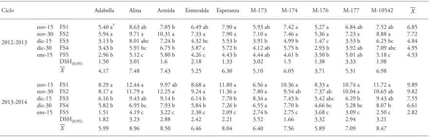 Low temperatures during the 2012-2013 agricultural cycle affected yield and physical quality of the grain. Temperatures fell to 0.4, -0.5 and 0.8 °C on March 3, 4, and 5. The low temperatures 109 days after FS1 did not apparently harm grain development. However, 94 d after FS2, they affected grain physical quality (thin grains), and 79 d after FS3, because of the cold temperatures, seeds did not develop possibly because most of them were in an aqueous stage. With FS4, the low temperatures occurred 64 days when the crop was between the boot stage and spiking; there was damage to the foliage, and seeds were absent in the spikes of the earliest genotypes (M-173, Armida and Alina). With FS5, the low temperatures occurred 48 days when most of the genotypes were in the boot stage, and damage was observed only in the foliage.