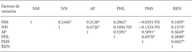 The correlations showed that when NM, PHL and PMG increased, REN also increased (Table 6). Hossain et al. (2012) found similar results. Moreover, REN was higher when NN and AP increased; this is attributed to the association of REN with plant dry matter accumulation since there is higher availability of assimilates for grain formation (López-Castañeda, 2011). In this study, expression of potential grain yield was influenced by environmental conditions. In both growing cycles evaluated the genotypes expressed higher NM, NN, AP, PHL, PMG and REN when sown on FS1, FS2 and FS3, but when sown on FS4 and FS5, these values decreased. Sowing on optimum or suitable sowing dates contributes to obtaining higher REN (Aslani and Mehrvar, 2012). However, REN decreases principally when sowing occurs in periods that coincide with high temperatures during grain filling (Soleymani and Shahrajabian, 2012).