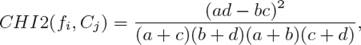 where N = a + b + c + d, fi is a feature and Cj is a class. a, b, c and d mean the number of training samples fi and Cj co-occur, Cj occurs without fi, fi occurs without Cj, neither Cj nor fi co-occur, respectively.