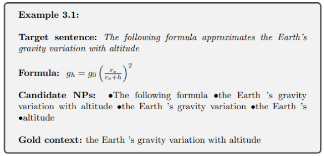 In example 1.2 above, the candidate NPs for the context of formula (pi1,pi2) are: "the simplest example of scattering of two colliding particles with initial momenta", "the simplest example", "scattering of two colliding particles with initial momenta", "scattering", "two colliding particles with initial momenta", "two colliding particles" and "initial momenta". Out of all the seven candidate NPs, the most appropriate one (i.e. "initial momenta”) occurs closest to the formula.