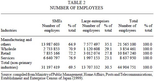 Table 2, shows the number of employees reported in the 1999 Establishment and Enterprise Census of Japan the Small and Medium Size Enterprises. To the 2001 Establishment and Enterprise Census, the total number of persons engaged reached 60 158 044. It is notorious the number of establishments21 increased to a total figure of 6 350 101.22