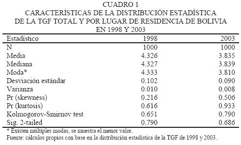La distribución normal es una de las más utilizadas en estudios que modelan la dinámica social de las poblaciones y está relacionada con los fenómenos naturales.1 Sobre todo cuando se cuenta con gran cantidad de datos se asume una distribución normal (basados en la LNG y el TLC) de los datos en estudio, aunque sería importante verificar si es correcto asumir directamente este supuesto, sobre todo cuando se trata de muestras pequeñas. El presente trabajo no asume de antemano la distribución normal de la TGF, sino que la encuentra y la evalúa mediante pruebas estadísticas. Tenemos como antecedente que Argote (2007) verificó que la distribución estadística de la TGF de Bolivia para 1998 tenía un comportamiento normal aplicando el test Kolmogorov Smirnov (sig. 0.790) con media 4.3, error estándar de 0.102 e intervalo de confianza a 95 por ciento [4.172, 4.499]. Cinco años después (2003) la TGF de la población del mismo país, de la cual se cuenta con una muestra obtenida con el mismo diseño muestral que en 1998, ¿también tendrá una distribución normal?