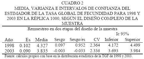 Se aplicó el remuestreo con reemplazo considerando las unidades primarias de muestreo (UPM) (en 1998 se tomaron 823 UPM y en 2003 se contó con 1000 UPM) y luego, dentro de éstas, las unidades secundarias de muestreo (USM u hogares). La varianza, el error estándar y el sesgo se calculan automáticamente a partir de la distribución por muestreo de la TGF, como indica la técnica del remuestreo. Una buena estimación del intervalo de confianza se obtiene en 1 000 réplicas (Efron y Tibshirani, 1993), por lo cual los resultados y las conclusiones se presentan tomando en cuenta esta referencia.2