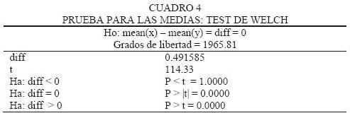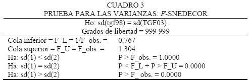 La varianza en 2003 es menor en 20 por ciento de la varianza en 1998. este hecho también se puede verificar en el diagrama de cajas (gráfico 2). donde la distancia entre extremos es menor en 2003, es decir, los datos en 2003 están más concentrados alrededor de la media. Según la prueba FSnedecor (véase cuadro 3), se rechaza la hipótesis de igual variabilidad entre ambas muestras (sig 0.0000). En virtud de lo anterior, el presente estudio constituye una comparación de muestras independientes con distintas varianzas, donde el test de Welch es apropiado.