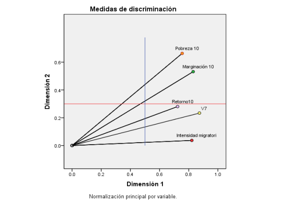Lo anterior se puede apreciar en las Figuras 1 y 2 en sus dimensiones 1 y 2. Se espera que las medidas de discriminación “discriminen” las variables para cada factor o dimensión. Al respecto, en las dos dimensiones que elabora el modelo para 2010 y 2015, en la primera dimensión o eje se destaca la intensidad migratoria, la zona metropolitana y el retorno. En el segundo eje tiene preponderancia la pobreza y la marginación tanto en 2010 y 2015. En términos gráficos queda como lo indican las Figuras 1 y 2.