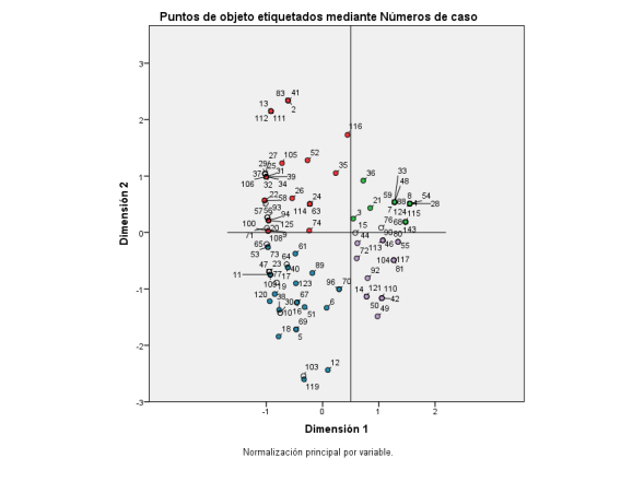 El modelo permite verificar la proximidad entre modalidades de una misma variable en términos de su parecido: son excluyentes por construcción, si son cercanas o están en el mismo cuadrante es porque los municipios que las poseen presentan casi el mismo comportamiento en las otras variables determinantes socioeconómicas.