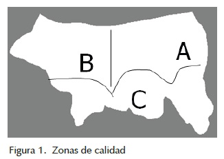 • Zonas de calidad. La piel se divide en zonas de calidad (máximo 3) basadas en la combinación de la textura y espesor. El tamaño y forma de las zonas varían en cada piel (figura 1).