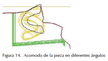 Como es aceptable tener variaciones en la alineación de la pieza con respecto a la línea de estiramiento de 10° a 10°, se ajusta la posición de la pieza en incrementos de 5°, posteriormente se gira la pieza a 180° y se repiten las variaciones especificadas (figura 14). En cada una de las variaciones se repite el barrido recolectándose las mejores posiciones de la pieza. Una vez recolectadas las mejores posiciones de cada ángulo, de este conjunto de posiciones se selecciona aquella cuyo desperdicio de espacio sea menor y se almacena como la posición definitiva.