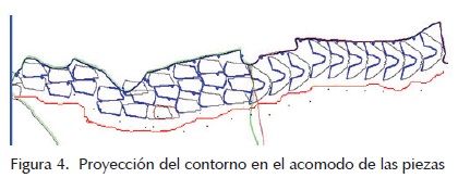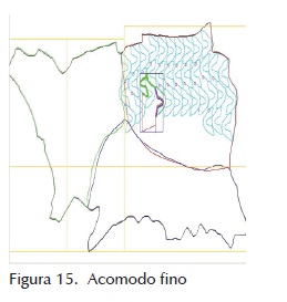 Ya ubicada la figura se verifica en qué porcentaje se encuentra dentro de la zona de calidad a la que pertenece y si está dentro de la piel. Si no cumple con el criterio de acomodo, se determina cuál es la zona de calidad que tiene más porcentaje de área y se busca en la base de datos una figura de esa calidad, con la cual, se repita el proceso, pero ahora para una pieza nueva (figura 15).
