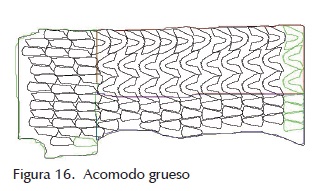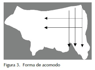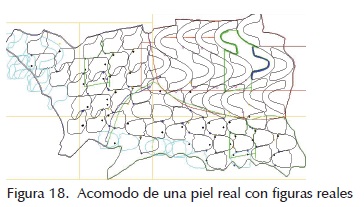 Una de las características de la piel es que su contorno no es lineal, varía de una piel a otra y en caso de tener defectos graves, la zona afectada puede cortarse, por ello la base inicial para el acomodo es el lomo de la piel. Si tiene un perfil sinuoso, las curvas se proyectarán hacia la parte inferior afectando la siguiente línea de figuras, provocando que disminuya la eficiencia del acomodo (figura 4).
