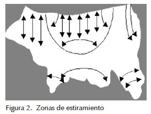 • Zonas de estiramiento. Son zonas en las cuales la piel se estira más fácilmente hacia una dirección. Las figuras que se acomodarán en estas zonas se ven afectadas por el estiramiento de su piel para su funcionamiento (figura 2).