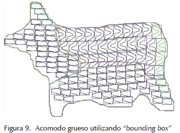 El acomodo grueso es un proceso que permite obtener un primer posicionamiento de la pieza a acomodar sobre la piel y se basa en el llamado "bounding box" de la figura, es decir, un rectángulo construido a partir de los puntos extremos de la figura a ubicar para determinar su cercanía, ya sea con piezas previamente acomodadas o con los bordes de la piel (figura 6).