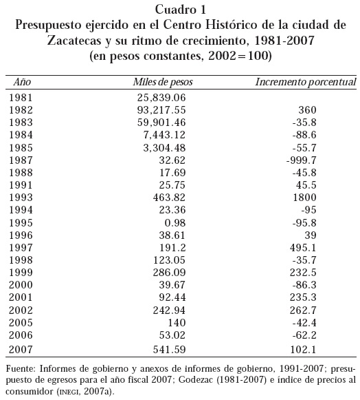 La primera durante el lapso de 1980 a 1985, donde los montos destinados a su regeneración y embellecimiento son los más altos de la historia. En este periodo la característica del destino del presupuesto fue embellecer las calles, las fachadas y restaurar edificios abandonados (templos, teatros, casonas); a pesar del claro retraimiento de la actividad económica en la década de los ochenta en el país que llevó a que se aplicaran políticas restrictivas en el gasto público el proyecto de regeneración y rehabilitación del CHZ tuvo su mejor momento (cuadro 1). El origen del financiamiento corrió a cargo exclusivamente del gobierno estatal, por medio del gasto programado en obra pública originado por los recursos extraordinarios provenientes del boom petrolero de 1980-1981. El objetivo de embellecer la ciudad fue dar los primeros pasos para atraer turistas y convertir esta actividad en el motor de desarrollo no sólo del CHZ, sino de la ciudad misma.