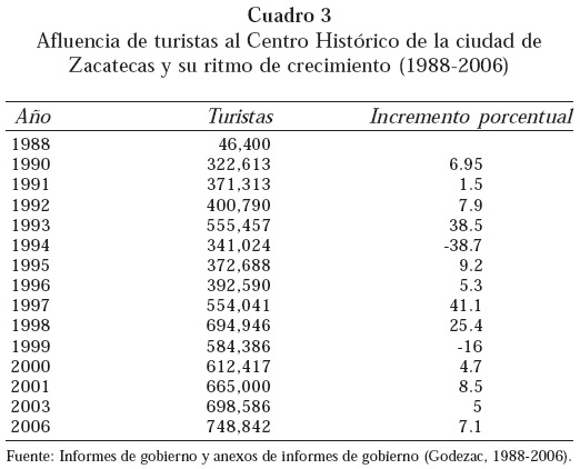 Desde la perspectiva de afluencia de turistas, en el cuadro 3 se muestra el número de turistas que visitaron la ciudad anualmente de 1988 a 2006. La primera idea que expresa es su comportamiento errático: el más evidente es de 1988 a 1990. Y aunque la tendencia a largo plazo es aumentar dicha afluencia, ésta no se ha dado de manera espectacular. Incluso, llama la atención que la declaración del CHZ como Patrimonio Cultural de la Humanidad en 1993 pareciera que tuvo un efecto negativo en la cantidad de turistas en los años siguientes, pues cayó en 61% y fue hasta cinco años después que recuperó el número de visitantes.