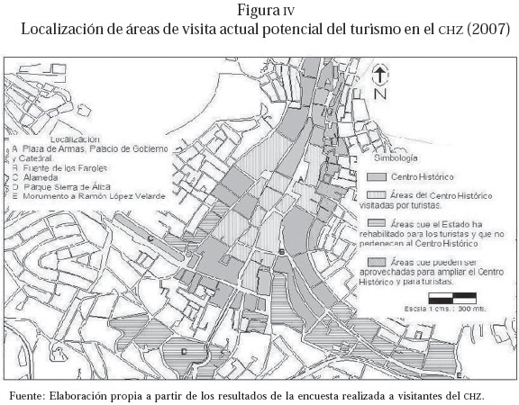 3. También está la tendencia contraria de abandono del mantenimiento de edificios públicos (iglesias, conventos, museos, teatros, casonas) que tienen poco valor turístico y muchos de los cuales albergan oficinas gubernamentales. Incluso hay zonas (barrios viejos) que se podrían aprovechar para aumentar la atracción y los recorridos turísticos, pero que en general requieren inversiones exorbitantes y cuya población mayoritaria es de ingresos medios y bajos (en la figura IV se muestran esas zonas potenciales).