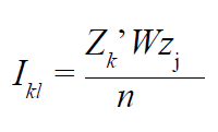 Sendo z k e z l as variáveis analisadas padronizadas, W é a matriz de pesos espaciais, para este estudo foi utilizada a matriz de pesos espaciais Rainha, o nome da matriz de peso espacial Rainha, é uma referência ao movimento desta peça em um jogo de xadrez, que além das fronteiras entre os municípios, também se considera os vértices. No denominado tem-se a variável n, isto é, o número de unidades espaciais, neste caso, o número de municípios do Estado do Paraná.