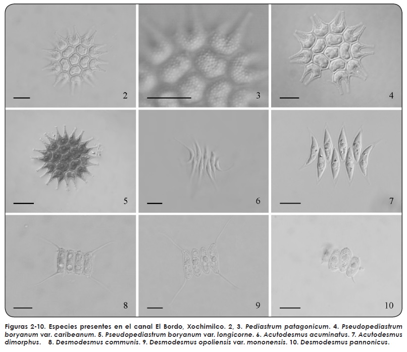 La división Chlorophyta fue el grupo mejor representado en el canal El Bordo durante el estudio (Tabla II); esta División incluyó principalmente especies de los géneros Desmodesmus, Pediastrum, Pseudopediastrum, Acutodesmus y Coelastrum. De acuerdo con nuestros resultados, las especies de estos géneros pertenecen a las categorías de dominantes y constantes (Figura 1) y tuvieron presencia continua en al menos dos meses consecutivos; se puede incluir a Lacunastrum gracillimum, clasificada como frecuente (Tabla II). Las especies de estos géneros han sido consideradas como integrantes del Grupo Funcional que se denomina "J", de acuerdo con Reynolds et al.5 (Figura 1).