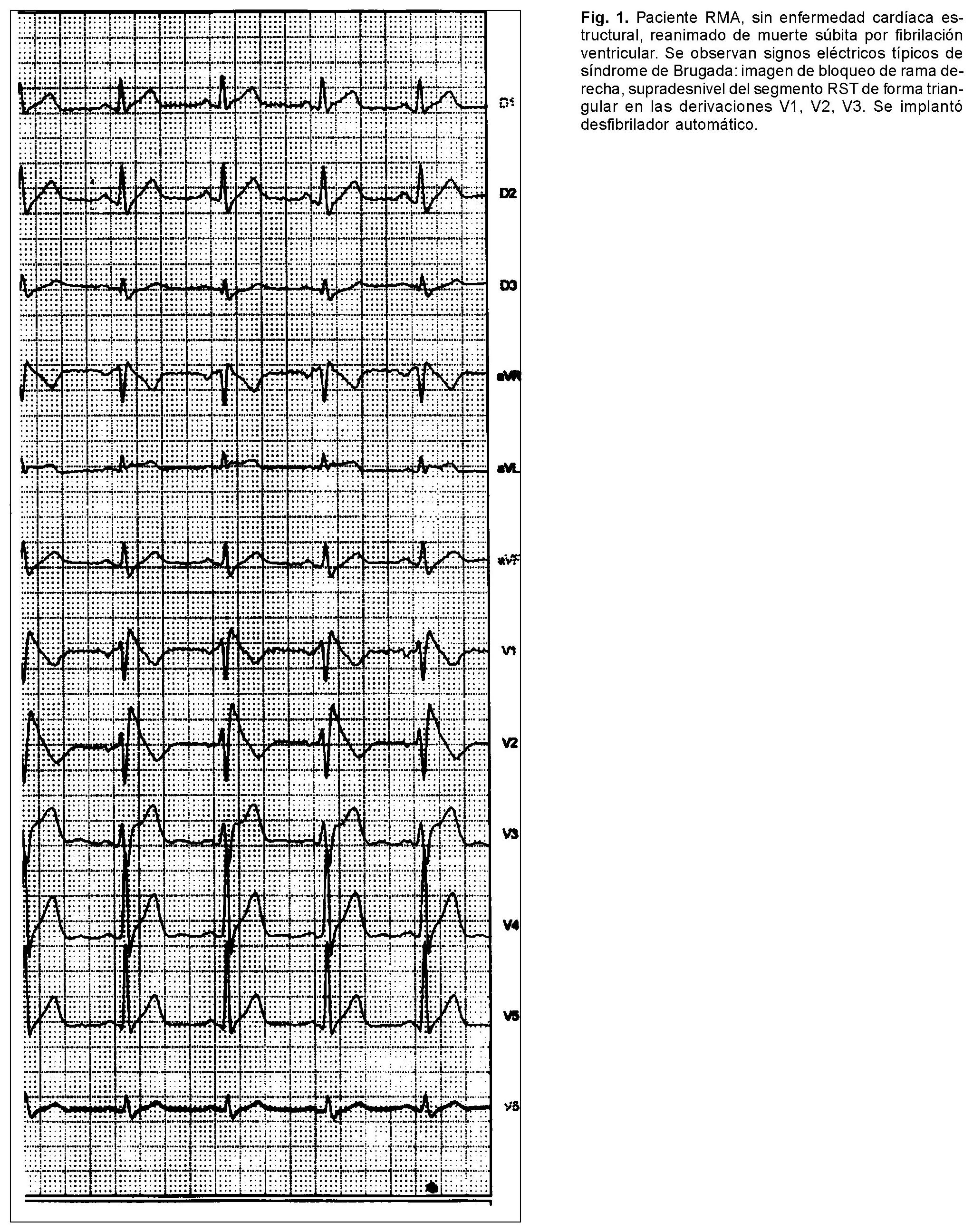 En nuestro servicio (centro nacional de referencia de estos casos), se han estudiado las varias subpoblaciones de muerte súbita por causa eléctrica en sujetos sin enfermedad cardíaca estructural demostrable (vías accesorias, intervalo QT prolongado, QT disperso, síndrome de Brugada, muerte súbita nocturna inexplicada, taquicardia ventricular idiopática, taquicardia ventricular polimórfica, torsión de puntas con intervalo corto de acoplamiento y fibrilación ventricular idiopática). En este tiempo, se han estudiado 17 pacientes reanimados de muerte súbita, sin enfermedad cardíaca estructural demostrable, con alguna de las entidades mencionadas; 7 de ellos con síndrome de Brugada, 41.2%.